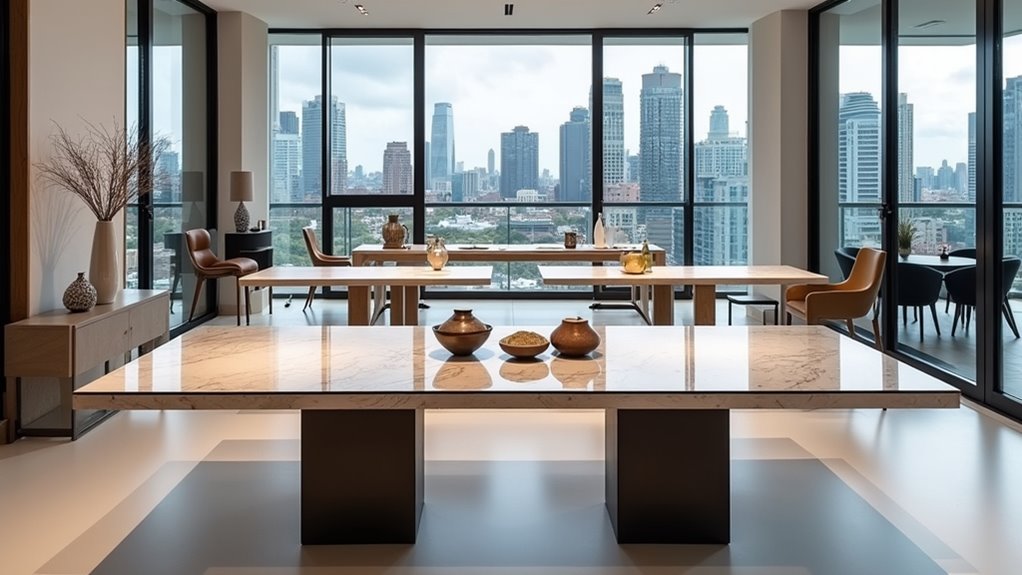 - Consider the luxurious marble-top dining tables, featuring unique veining patterns and durable stainless steel frames.